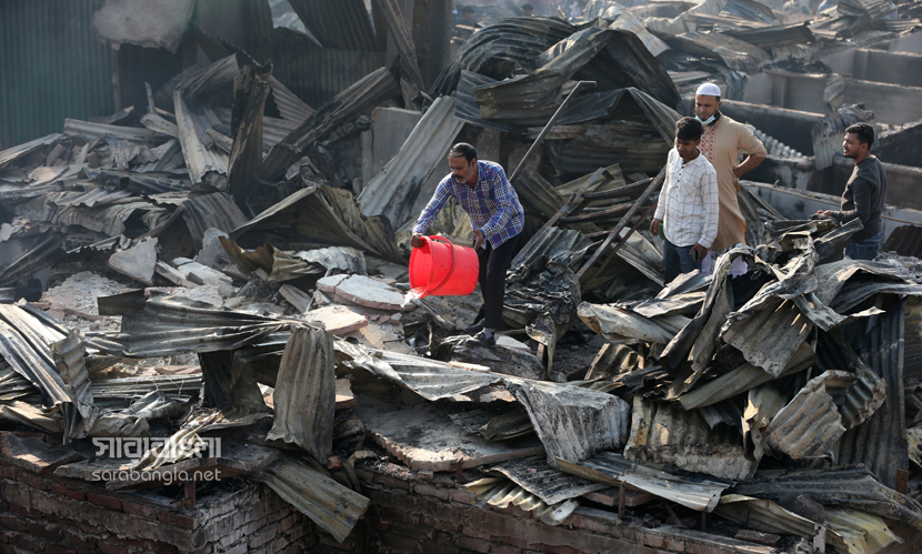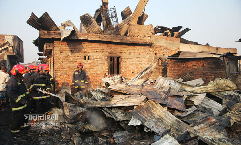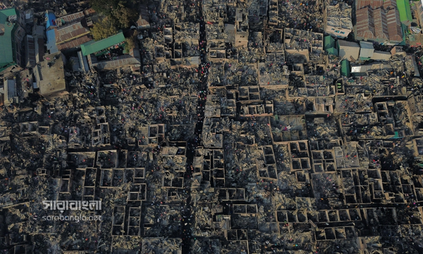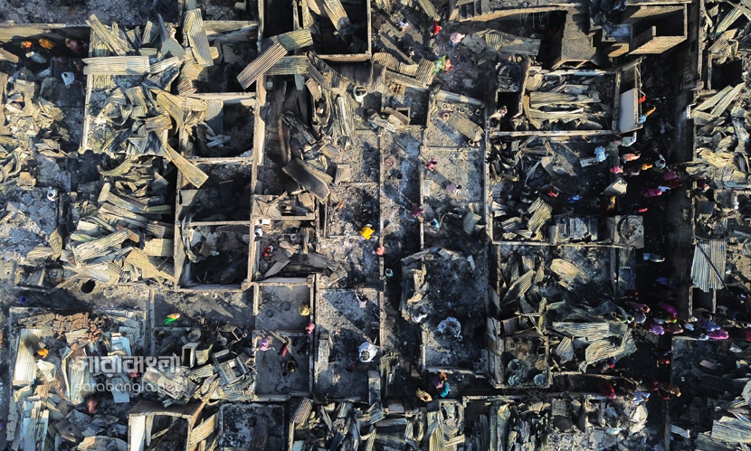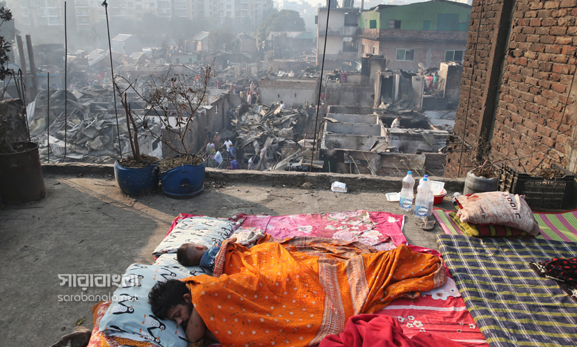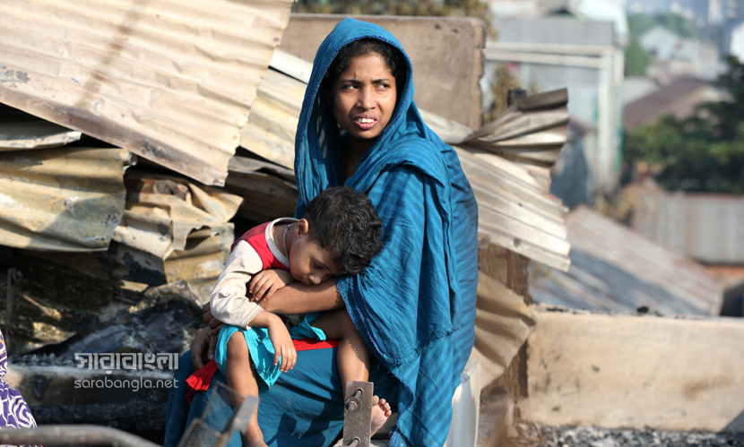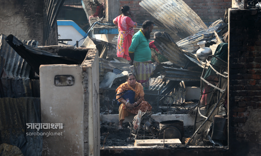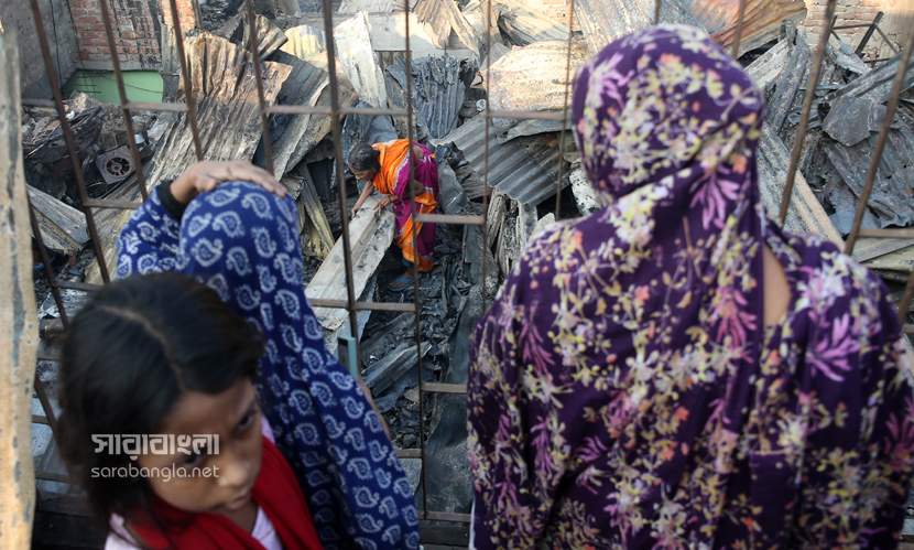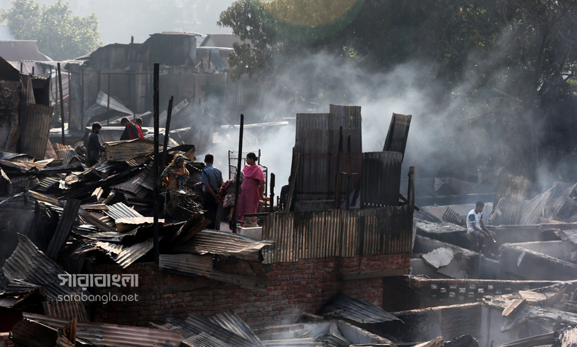 কড়াইল বস্তিতে আগুনে পুড়ে ছাই হয়ে গেছে কয়েকশ’ ঘর। আসবাবপত্র কিছুই যেন অবশিষ্ট নেই। পরিবার নিয়ে খোলা আকাশের নিচে ঠাঁই হয়েছে সবার। কেউ কেউ আগুনে পোড়া ধ্বংসস্তূপের মাঝে টিন ও লোহালক্কর খুঁজছেন। কেউ আবার নতুন করে স্বপ্ন বোনার আশায় পুড়ে যাওয়া ঘরের ধ্বংসস্তূপ পরিষ্কার-পরিচ্ছন্ন করছেন। এই কয়েক মুহূর্তের মধ্যেই সব যেন মেনে নিয়েছেন তারা। সহায়-সম্বল হারানো মানুষগুলোর চোখে-মুখে তাই ফের ঘর বানানোর স্বপ্ন উঁকি দিচ্ছে। আগুন নির্বাপণের পর কড়াইল বস্তি ঘুরে ছবিগুলো ফ্রেমবন্দি করেছেন সারাবাংলার সিনিয়র ফটোকরেসপন্ডেন্ট হাবিবুর রহমান।