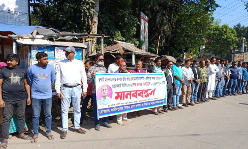 মানববন্ধনে ফরিদপুর প্রেসক্লাবের সভাপতি কবিরুল ইসলাম সিদ্দিকীসহ জেলায় কর্মরত সাংবাদিক ও সর্বস্তরের জনগণ উপস্থিত ছিলেন।