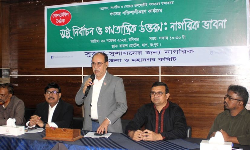 রোববার (৩০ নভেম্বর) বিকেল থেকে রাত পর্যন্ত রংপুর নগরীর একটি হোটেলের কনফারেন্স রুমে ‘সুষ্ঠু নির্বাচন ও গণতান্ত্রিক উত্তরণ: নাগরিক ভাবনা’ শীর্ষক গোল টেবিল বৈঠকে এসব কথা উঠে এসেছে। সুজনের রংপুর জেলা ও মহানগর কমিটির আয়োজনে অনুষ্ঠিত এই বৈঠকে ছাত্র-শিক্ষক, আইনজীবী, সাংবাদিক, সাংস্কৃতিক কর্মী, জনপ্রতিনিধি এবং পেশাজীবী সংগঠনের প্রতিনিধিরা অংশ নেন।