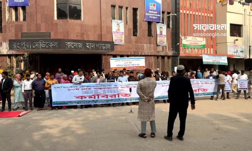 রংপুর মেডিকেল কলেজ হাসপাতালের টেকনোলজিস্ট ও ফার্মাসিস্টরা হাসপাতালের প্রধান ফটকে অবস্থান নিয়ে তাদের দাবি তুলে ধরেন।
