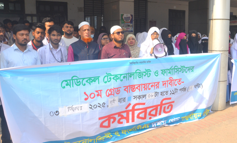 বগুড়া: ১০ম গ্রেড বাস্তবায়নের দাবিতে বগুড়াতে অর্ধদিবস কর্মবিরতি পালন করছে মেডিকেল টেকনোলজিস্ট ও ফার্মাসিস্ট ১০ম গ্রেড বাস্তবায়ন পরিষদ।