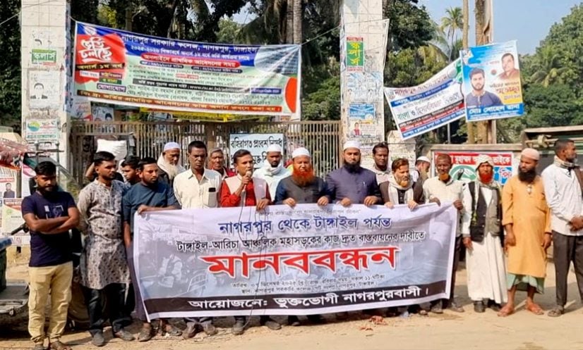 টাঙ্গাইল: টাঙ্গাইল-আরিচা আঞ্চলিক সড়কের কাজ দ্রুত বাস্তবায়নের দাবিতে টাঙ্গাইলের নাগরপুরে মানববন্ধন অনুষ্ঠিত হয়েছে।