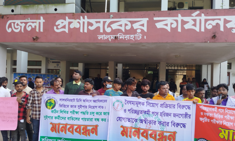 লালমনিরহাট: বৈষম্যমূলক নিয়োগ প্রক্রিয়া ও পরিচ্ছন্নতাকর্মী পদে নিয়োগের ক্ষেত্রে লিখিত পরীক্ষা কঠোরতা শিথিল করে দক্ষতাভিত্তিক পরীক্ষা পদ্ধতি প্রণয়ন এবং নিয়োগ পরীক্ষা বাতিলের দাবিতে লালমনিরহাটে হরিজন ঐক্য পরিষদের মানববন্ধন অনুষ্ঠিত হয়েছে।