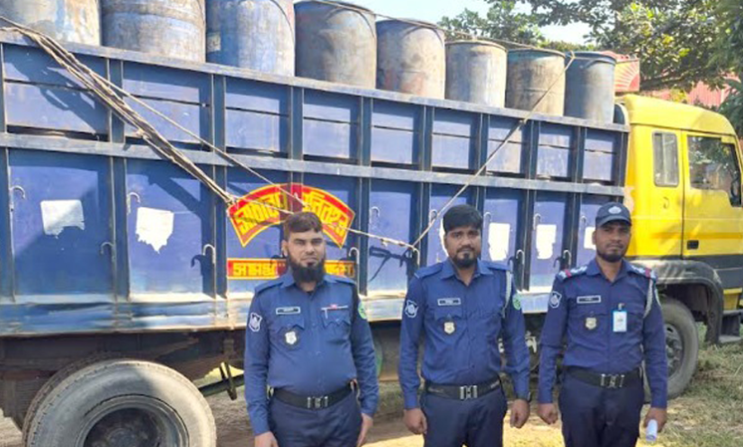 পুলিশ ট্রাকের ভেতরে থাকা ৭০ ব্যারেল সয়াবিন তেল উদ্ধার করে, যার বাজার মূল্য প্রায় ২৪ লাখ টাকা। ছবি: সারাবাংলা