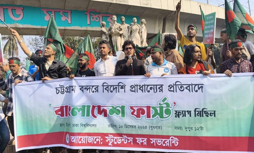 ঢাবি: চট্টগ্রাম বন্দরে বিদেশি প্রাধান্যের প্রতিবাদে ঢাকা বিশ্ববিদ্যালয়ে ‘বাংলাদেশ ফার্স্ট’ ফ্ল্যাগ মিছিল করেছে স্টুডেন্ট ফর সভরেন্টি নামক একটি সংগঠন।