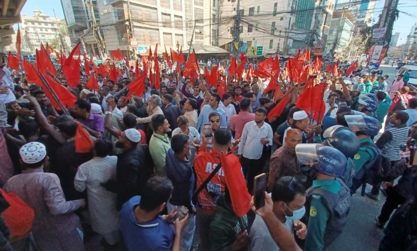 চট্টগ্রাম: চট্টগ্রাম বন্দরের নিউমুরিং, কনটেইনার টার্মিনালসহ (এনসিটি) বিভিন্ন স্থাপনা বিদেশি প্রতিষ্ঠানকে ইজারা দেওয়ার প্রক্রিয়া বন্ধের দাবিতে ‘লাল পতাকা গণমিছিল’ করেছে শ্রমিক-কর্মচারী ঐক্য পরিষদ (স্কপ)। বন্দর ভবন অভিমুখে শ্রমিকরা মিছিল নিয়ে যাবার চেষ্টা করলেও পুলিশের বাধায় তারা এগোতে পারেনি।