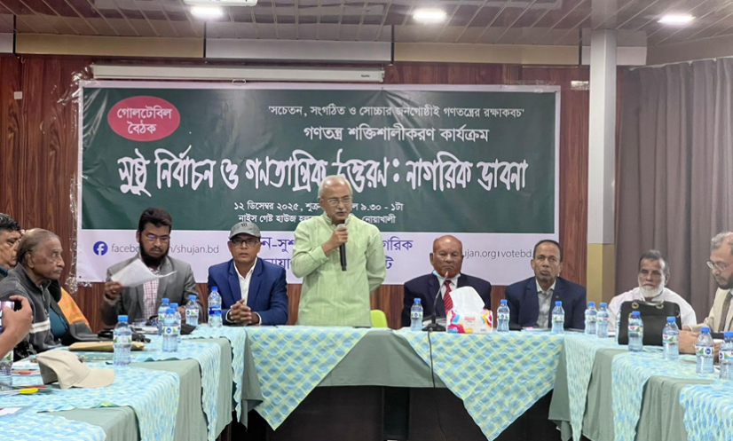 নোয়াখালী: নোয়াখালীতে ‘সুষ্ঠু নির্বাচন ও গণতান্ত্রিক উত্তরণ: নাগরিক ভাবনা’ শীর্ষক গোলটেবিল বৈঠক অনুষ্ঠিত হয়েছে। শুক্রবার (১২ ডিসেম্বর) দিনব্যাপী জেলা শহরের নাইস গেস্ট হাউজ হলরুমে সুশাসনের জন্য নাগরিক (সুজন) এ আয়োজন করে। গোলটেবিল বৈঠকে লেখক-গবেষক, শিক্ষাবীদ, আইনজীবী, সাংবাদিক, মানবাধিকারকর্মী, তরুণ ভোটার এবং সুজন-এর জেলা, উপজেলা কমিটির নেতৃবৃন্দসহ বিভিন্ন শ্রেণি-পেশার ৮০ জন প্রতিনিধি অংশগ্রহণ করেন।