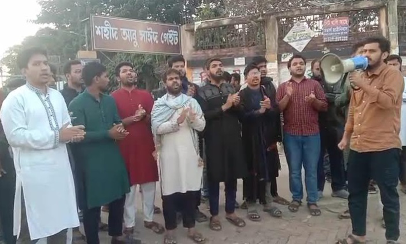 শুক্রবার (১২ ডিসেম্বর) সন্ধ্যায় বিশ্ববিদ্যালয়ের শিক্ষার্থীরা শহিদ আবু সাঈদ ফটকের সামনে মিছিল বের করেন। তারা ক্যাম্পাস স্লোগানে মুখরিত করে তোলে এবং হামলাকারীদের দ্রুত গ্রেফতার ও বিচারের দাবি জানান।