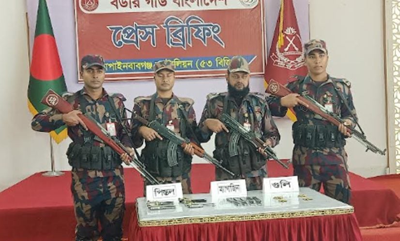 চাঁপাইনবাবগঞ্জ: চাঁপাইনবাবগঞ্জের মনোহরপুর সীমান্তে ৪টি বিদেশি পিস্তল, ৯টি ম্যাগাজিন ও ২৪ রাউন্ড গুলি উদ্ধার করেছে বিজিবি।