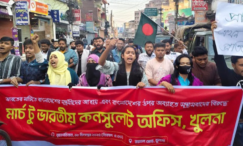 বৃহস্পতিবার (১৮ ডিসেম্বর) বিকেলে আন্দোলনকারীরা নগরীর সামসুর রহমান রোডের ভারতীয় সহকারী হাইকমিশন অফিসের সামনে অবস্থান নেন।