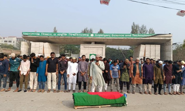 শনিবার (২০ ডিসেম্বর) আছরের নামাজের পর বিশ্ববিদ্যালয়ের কেন্দ্রীয় মসজিদের সামনে এ জানাজা অনুষ্ঠিত হয়। এতে বিভিন্ন মসজিদ থেকে আসা মুসল্লিসহ স্থানীয় রাজনৈতিক ও সামাজিক সংগঠনের নেতাকর্মী এবং সর্বস্তরের মানুষ অংশ নেন।
