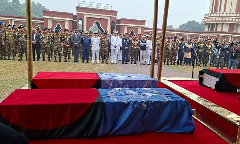 রোববার (২১ ডিসেম্বর) সকাল সাড়ে ৯টার দিকে ঢাকা সেনানিবাসের কেন্দ্রীয় মসজিদে তাদের জানাজার নামাজ অনুষ্ঠিত হয়। জানাজা শেষে শহিদ শান্তিরক্ষীদের মরদেহে রাষ্ট্রপতি ও প্রধান উপদেষ্টার পক্ষ থেকে শ্রদ্ধা জানানো হয়।
