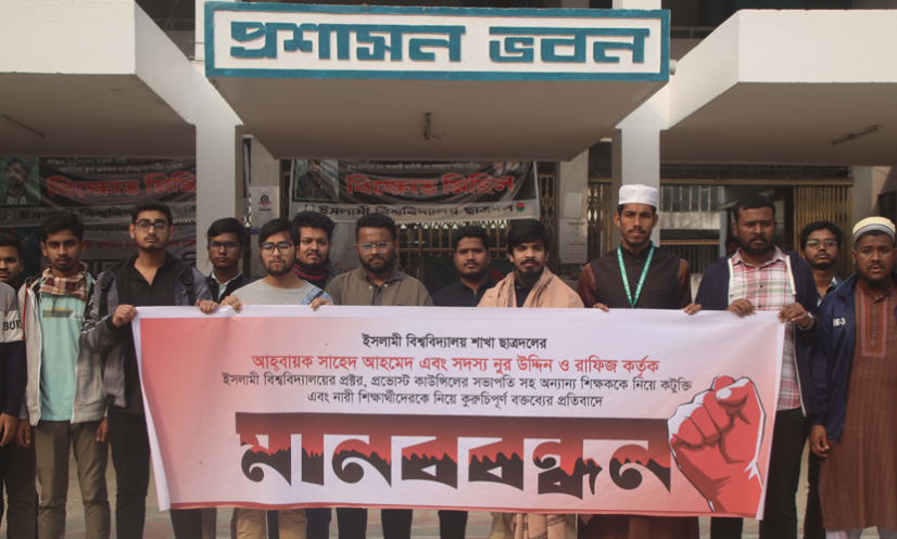 মানববন্ধনে শিক্ষার্থীরা বলেন, ‘যেসব শিক্ষকদের নিয়ে কুরুচিপূর্ণ মন্তব্য করা হয়েছে, তারা বিশ্ববিদ্যালয়ের পরিশ্রমী ও সুনামধন্য শিক্ষকদের মধ্যে কয়েকজন। শুধু ওই শিক্ষকরা নন, বরং বিশ্ববিদ্যালয়ের যেকোনো শিক্ষকের সম্পর্কে একটি ছাত্র সংগঠনের শীর্ষ পর্যায়ের নেতাদের এ ধরনের ন্যাক্কারজনক মন্তব্য কোনোভাবেই কাম্য নয়। আমরা চাই, তাদের ক্ষমা চাওয়া শুধু প্যাডে সীমাবদ্ধ না থেকে প্রকাশ্যে জনসম্মুখে হোক।’