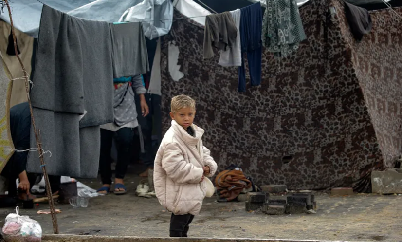 একটি বাস্তুচ্যুত ফিলিস্তিনি শিশু আশ্রয়স্থলের বাইরে দাঁড়িয়ে আছে। ছবি: আল জাজিরা