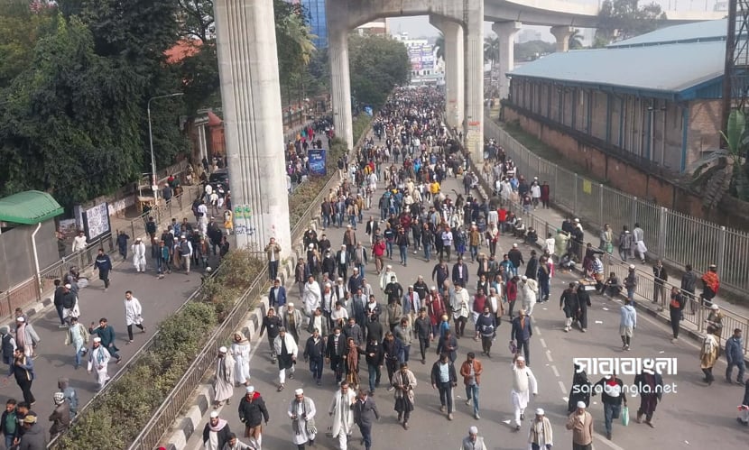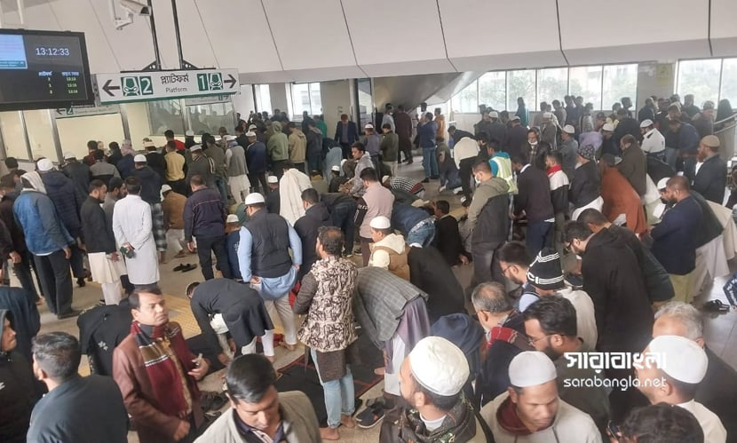 মতিঝিল থেকে উত্তরাগামী মেট্টোরেলে উপচে পড়া ভিড় সামলে কোনোরকম উঠে এসে ফার্মগেটে নামছেন। আবার উত্তরা থেকে একেবারেই ঠাসা মানুষ এসে বিজয় সরণি ও ফার্মগেটে নামছে। ফার্মগেট স্টেশনে নামার পর তিল ধারণের ঠাই নাই দাঁড়ানোর। পুরো স্টেশন জুড়ে জানাজার নামাজের জন্য দাঁড়িয়ে গেছেন মানুষেরা। সড়কেও জায়গা নেই। একই অবস্থা বিজয় সরণি স্টেশনেও।