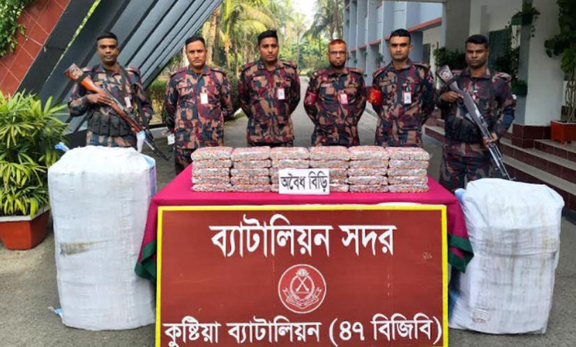 বিজিবি জানায়, গোয়েন্দা তথ্যের ভিত্তিতে কুষ্টিয়া ব্যাটালিয়ন (৪৭ বিজিবি) শুক্রবার সকাল ১০টার দিকে জেলার ত্রিমোহনী বাইপাস এলাকায় অভিযান পরিচালনা করে পরিত্যক্ত অবস্থায় ৪ হাজার ২০৬ প্যাকেট অবৈধ নকল বিড়ি উদ্ধার করে।