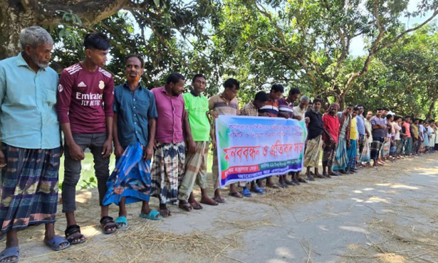 মানববন্ধনে বক্তব্য দেন মো. সাইফুল আলম, মো. রিয়াজ রায়হান, মো. উজ্জ্বলসহ স্থানীয় অন্যান্য সচেতন নাগরিকরা।