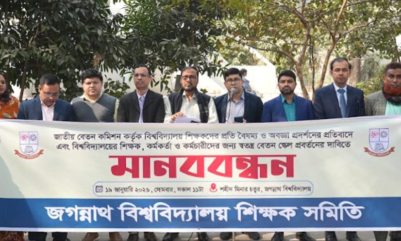 মানববন্ধনে সভাপতিত্ব করেন জবি শিক্ষক সমিতির সভাপতি অধ্যাপক ড. মো. রইছ উদ্দীন। সভাপতির বক্তব্যে তিনি বলেন, ‘৫ আগস্ট বৈষম্য নিরসনের লক্ষ্যে সারাদেশব্যাপী যে আন্দোলন হয়েছিল, তার মূল প্রত্যাশা ছিল একটি বৈষম্যহীন বাংলাদেশ গঠন। কিন্তু বাস্তবতা হলো, বৈষম্য দূর হওয়ার পরিবর্তে বিশ্ববিদ্যালয়ের শিক্ষক, কর্মকর্তা ও কর্মচারীদের ক্ষেত্রে তা আরও বহুগুণ বৃদ্ধি পেয়েছে।’