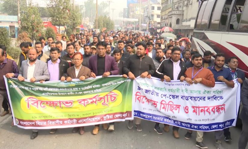 কুষ্টিয়া: কুষ্টিয়ায় ৯ম জাতীয় পে-স্কেল বাস্তবায়নের দাবিতে বিক্ষোভ মিছিল ও সমাবেশ করেছে সরকারি কর্মচারীরা।