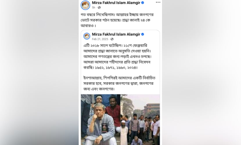 উল্লেখ্য, মির্জা ফখরুল তার শেয়ার করা পুরনো পোস্টটিতে ২০১৮ সালের একটি ঘটনার স্মৃতিচারণ করেছিলেন। সেখানে তিনি উল্লেখ করেছিলেন যে, আওয়ামী লীগ সরকারের সময় তাদেরকে ২১শে ফেব্রুয়ারিতে ভাষা শহিদদের প্রতি শ্রদ্ধা জানাতে অনুমতি দেওয়া হয়নি। সেই পোস্টে তিনি লিখেছিলেন, ‘আমাদের গণতন্ত্রের জন্য লড়াই এখনও চলছে। আমরা আমাদের শহিদদের প্রতি শ্রদ্ধা নিবেদন করছি—১৯৫২, ১৯৭১, ১৯৯০, ২০২৪।’