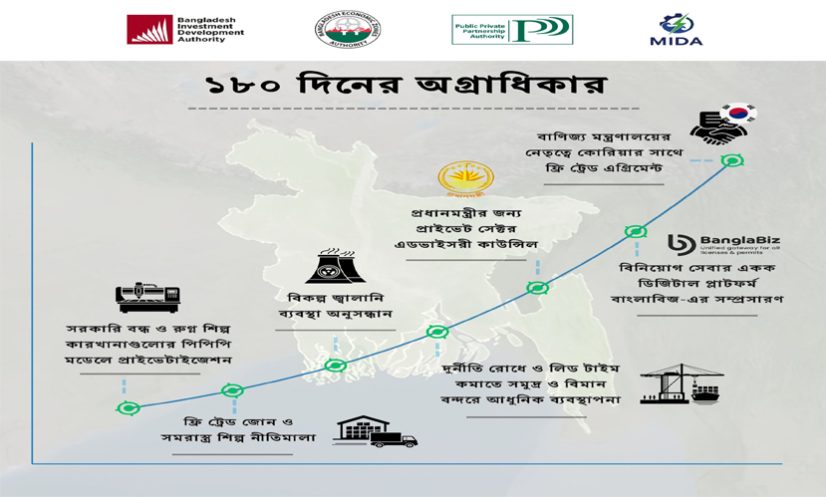 ঢাকা: প্রধানমন্ত্রী তারেক রহমান-কে ১৮০ দিনের একটি পরিকল্পনা দিয়েছেন বাংলাদেশ বিনিয়োগ উন্নয়ন কর্তৃপক্ষ (বিডা) ও বাংলাদেশ অর্থনৈতিক অঞ্চল কর্তৃপক্ষ (বেজা)-এর নির্বাহী চেয়ারম্যান আশিক চৌধুরী (প্রতিমন্ত্রীর পদমর্যাদা)।