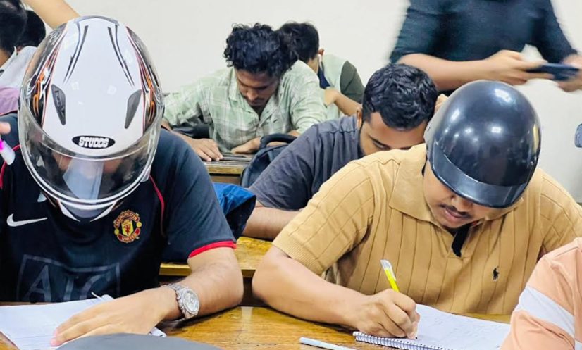 জবি: জগন্নাথ বিশ্ববিদ্যালয়ে (জবি) গণিত বিভাগের সেমিনার কক্ষে ছাদের পলেস্তারা ধসে দুই শিক্ষার্থী আহত হওয়ার ঘটনার মাথায় প্রতীকী হেলমেট পরে ক্লাস করতে বসেছেন শিক্ষার্থীরা।