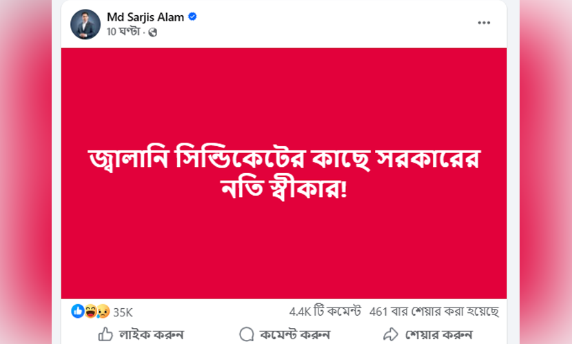 শনিবার দিবাগত রাতে নিজের ভেরিফাইড ফেসবুক পেজে দেওয়া এক পোস্টে সারজিস আলম সরকারের এই পদক্ষেপের কঠোর সমালোচনা করেন। তিনি স্পষ্টভাবে উল্লেখ করেন যে, জ্বালানি সিন্ডিকেটের কাছে সরকার নতি স্বীকার করেছে।