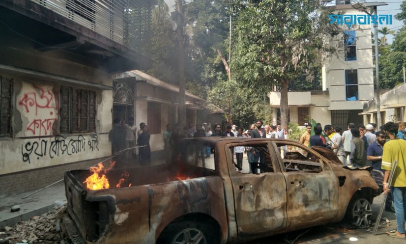 ভাঙচুর ও অগ্নিসংযোগ করে ছাত্র-জনতারা। ছবি: সারাবাংলা