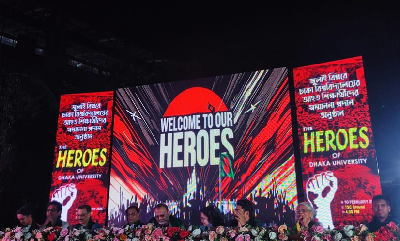 সোমবার (১০ ফেব্রুয়ারি) সন্ধ্যায় ঢাকা বিশ্ববিদ্যালয়ের টিএসসিতে বৈষম্যবিরোধী আয়োজিত ‘দ্য হিরোস অব ঢাকা ইউনিভার্সিটি’ অনুষ্ঠানে এ সম্মাননা দেওয়া হয়।