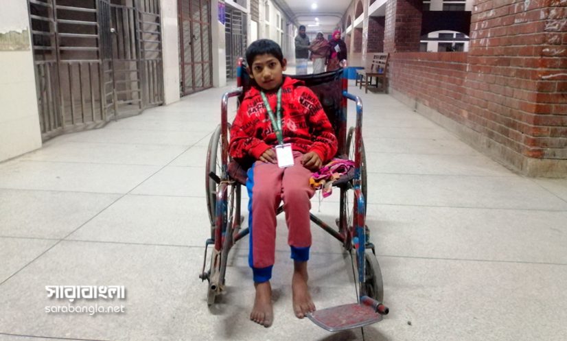 রাত ১০ টার দিকে জরুরি বিভাগের সামনে দেখা যায় শিশু বেলাল ট্রলিতে বসে পায়ে পায়ে ঠেলে এক জায়গা থেকে অন্য জায়গায় যাচ্ছে। সেখানে দুই ভবনের মেঝেতে কিছুটা উঁচু-নিচু থাকায় পা দিয়ে ট্রলি ঠেলতে কষ্ট হচ্ছিল তার। এই প্রতিবেদক এগিয়ে গিয়ে ট্রলি ঠেলে দেওয়ার চেষ্টা করলে বাধা দেয় বেলাল। অস্পষ্ট কণ্ঠে জানায়, সে-ই পারবে। তখন শিশুটিকে অনুসরণ করতে থাকেন প্রতিবেদক। কিছুক্ষণ পর সেখানেই দেখা মেলে তার মা ফাহিমার সঙ্গে। ফাহিমা অন্য একটি ট্রলিতে করে হাসপাতালের ছয় তলায় রোগী নিয়ে যাচ্ছিলেন। রোগী ঠেলতে ঠেলতেই এই প্রতিবেদকের সঙ্গে কথা বলেন বেলালের মা ফাহিমা।