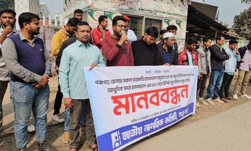 পঞ্চগড়: পঞ্চগড় আধুনিক সদর হাসপাতালসহ পঞ্চগড়ের সকল উপজেলা স্বাস্থ্য কমপ্লেক্সে চিকিৎসক সংকট দূর করারসহ স্বাস্থ্য খাতে বৈষম্য দূর করতে পাঁচ দাবিতে মানববন্ধন করেছে জাতীয় নাগরিক কমিটি।
