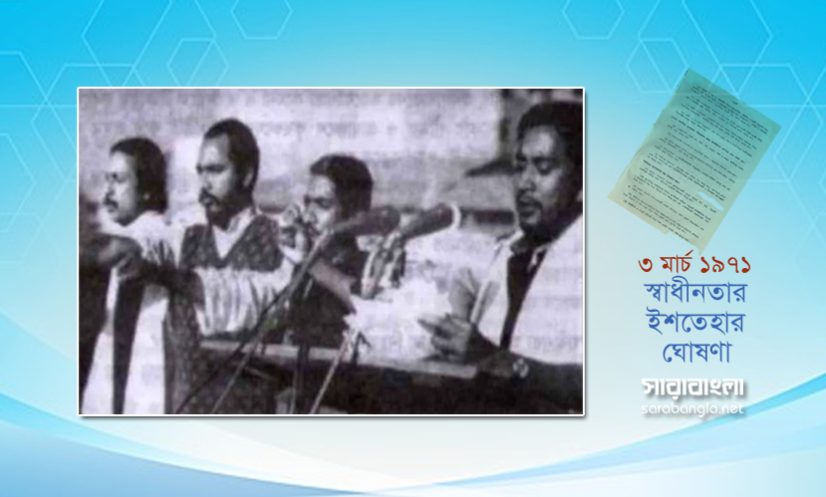ঢাকা: ১৯৭১ সালের ৩ মার্চ। এদিন সারাদেশে পূর্ণদিবস হরতাল পালিত হয়। এই দিনে তৎকালীন পল্টন ময়দান থেকে স্বাধীন বাংলা কেন্দ্রীয় ছাত্র-সংগ্রাম পরিষদের জনসভা থেকে অসহযোগ আন্দোলনের ডাক দেওয়া হয়। সেদিনই ছাত্র-সংগ্রাম পরিষদের চার নেতা নূরে আলম সিদ্দিকী, শাজাহান সিরাজ, আ স ম আবদুর রব ও আবদুল কুদ্দুস মাখন স্বাধীনতা ও মুক্তিসংগ্রামে ঝাঁপিয়ে পড়ার শপথ নেন।