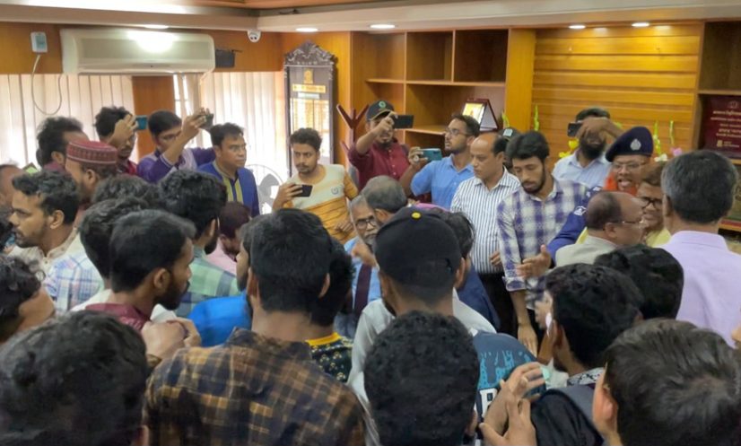 এ সময় রেজিস্ট্রার পদে নিয়োগ দিয়ে তাদের মধ্যে হট্টগোলের সৃষ্টি হয়। এ সময় সাংবাদিকরা সেখানে প্রবেশ করলে তাদের বের করে দেওয়া হয়। এক পর্যায়ে উপাচার্যের কার্যালয়ে উপ-উপাচার্য ও প্রক্টর বডির মধ্যে কথাকাটাকাটি শুরু হয়। এ সময় কক্ষের মধ্যে উচ্চবাচ্য শুনে বৈষম্যবিরোধী ছাত্র আন্দোলনের শিক্ষার্থীরা উপাচার্যের কার্যালয়ে প্রবেশ করে। পরে বৈষম্যবিরোধী ছাত্র আন্দোলনের সমন্বয়ক এস এম সুইট ও শাখা ছাত্রদলের আহ্বায়ক সাহেদ আহম্মেদের মধ্যে উত্তপ্ত বাক্য বিনিময় হয়।