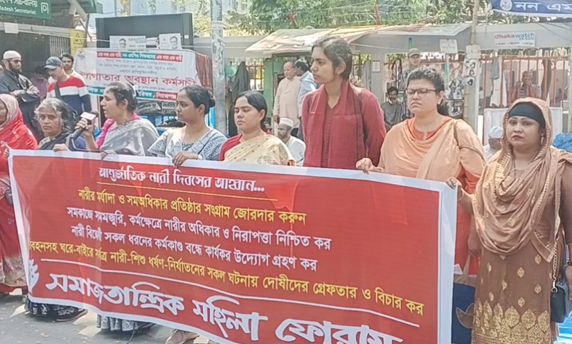 সমাবেশে অংশ নেওয়া নারী নেত্রীরা বলেন, ‘সমাজের সব ক্ষেত্রে নারীর ভূমিকা পালন, অধিকার প্রতিষ্ঠা এবং বহুযুগের লাঞ্ছনার অবসান ঘটিয়ে মানবিক মর্যাদা প্রতিষ্ঠার অঙ্গীকার নিয়ে আন্তর্জাতিক নারী দিবসের সূচনা হয়। কিন্তু নারী দিবস প্রতিষ্ঠার ১১৫ বছর পরও আমাদের দেশের নারীরা আইনগতভাবে, পারিবারিকভাবে, কর্মক্ষেত্রসহ সবক্ষেত্রে চূড়ান্ত বৈষম্যের শিকার। বর্তমানে যুক্ত হয়েছে নারী-বিদ্বেষী কর্মকাণ্ড। নারীর পোশাক, চলাফেরা, খেলাধুলা সবকিছুতে তাকে হেনস্থার শিকার হতে হচ্ছে।’