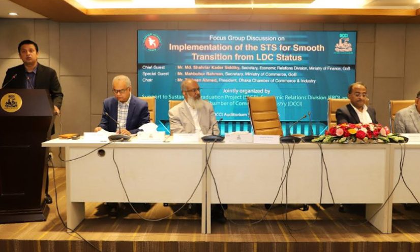 সোমবার (১০ মার্চ) ঢাকা চেম্বার অব কমার্স অ্যান্ড ইন্ডাস্ট্রি (ডিসিসিআই) এবং অর্থনৈতিক সম্পর্ক বিভাগ (ইআরডি)-এর সাপোর্ট টু সাসটেইন্যাবল গ্রাজুয়েশন প্রজেক্ট (এসএসজিপি) যৌথভাবে ‘এলডিসি উত্তরণে ‘মসৃণ রূপান্তর কৌশল (এসটিএস) বাস্তবায়ন’ শীর্ষক ফোকাস গ্রুপ আলোচনা সভায় বক্তারা এসব কথা বলেন। এতে অর্থনৈতিক সম্পর্ক বিভাগ (ইআরডি)-এর সচিব মো. শাহরিয়ার কাদের ছিদ্দিকী এবং বাণিজ্য সচিব মাহবুবুর রহমান উপস্থিত ছিলেন।