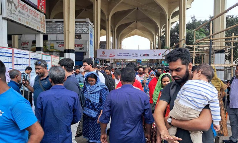 শনিবার (৫ এপ্রিল) রাজধানীর কমলাপুর রেলস্টেশন ঘুরে দেখা গেছে ঘরমুখো মানুষের উপচে পড়া ভিড়।