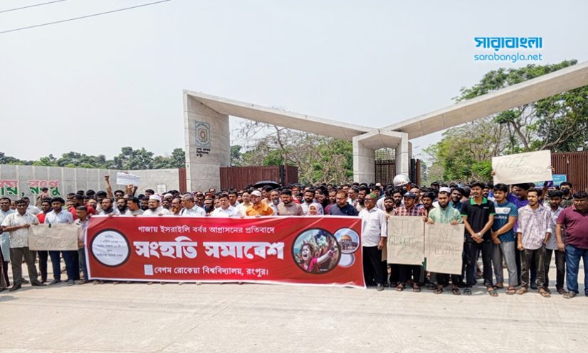 রংপুর: গাজায় ইসরায়েলি বর্বর আগ্রাসন ও হামলার প্রতিবাদে রংপুরে বিভিন্ন স্থানে বিক্ষোভ ও সমাবেশ করেছেন শিক্ষার্থী ও সাধারণ জনগণ। বিশেষ করে বিশ্ববিদ্যালয় ও কলেজগুলোতে জোরেশোরে এ কর্মসূচি পালিত হচ্ছে। এতে বিভিন্ন শিক্ষাপ্রতিষ্ঠানে ক্লাস-পরীক্ষা বন্ধ রয়েছে।