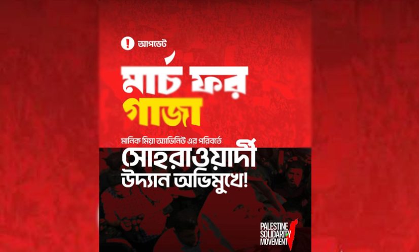 ঢাকা: ঢাকায় চলমান বিনিয়োগ সম্মেলন ও এসএসসির পরীক্ষার কারণে ‘মার্চ ফর গাজা’র স্থান পরিবর্তন করেছে ফিলিস্তিন সলিডারিটি মুভমেন্ট। আগামী শনিবার (১২ এপ্রিল) বিকেল ৩ টায় সোহরাওয়ার্দী উদ্যানে এ কর্মসূচি পালন করবে তারা।