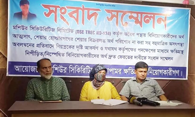 সংবাদ সম্মেলনে ফারহান জাফরিন নামের একজন বিনিয়োগকারী বলেন, আমার ২৫ বছরের চাকরির সব টাকা মেরে দিয়েছে মশিউর সিকিউরিটিজ, কোটি টাকার উপরে হবে। আমি এখন পথের ভিখারি। বাংলাদেশে কি কেউ নেই যে এই বাটপারের বিচার করতে পারেন? আমি প্রধান উপদেষ্টার দৃষ্টি আকর্ষণ করছি।