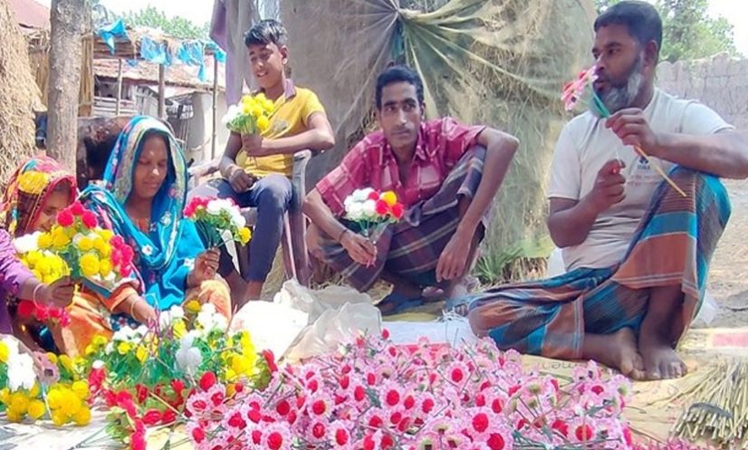 সংসার দেখভাল করার পাশাপাশি গ্রামের নারী-পুরুষ, স্কুল-কলেজের শিক্ষার্থী, ছোট-বড় সবাই ফুল তৈরি করার কাজ করে থাকেন। দেশের বিভিন্ন স্থানে বসবে বৈশাখী মেলা আর এই মেলাগুলোকে আরও বর্ণিল সাজে সাজাতে তাদের এই প্রাণান্তর চেষ্টা। আর তাই পহেলা বৈশাখ উপলক্ষ্যে কাক ডাকা ভোর থেকে শুরু করে রাত অবধি কাজ করে যাচ্ছেন ফুল তৈরির কারিগররা।