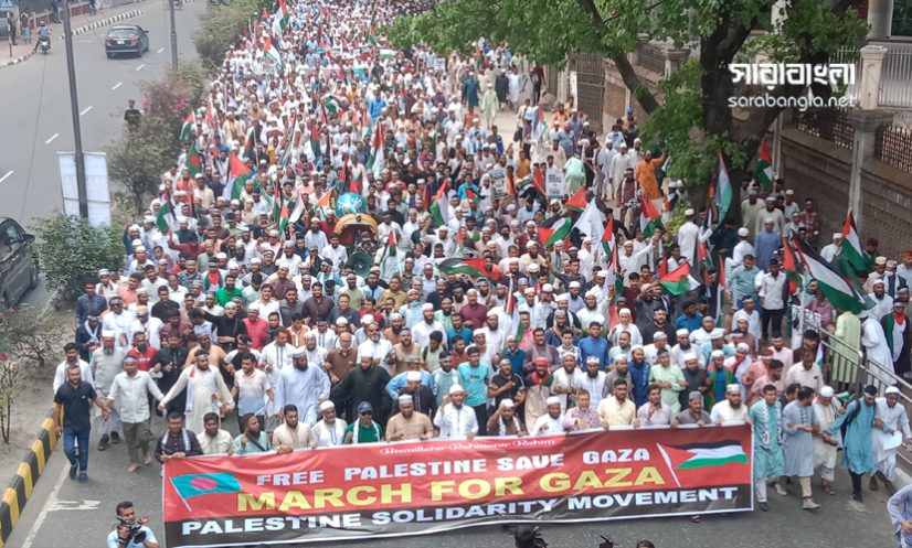 ঢাকা: ফিলিস্তিনের গাজা ও রাফা শহরে ইসরায়েলি বাহিনীর বর্বরোবিত গণহত্যার প্রতিবাদে ‘প্যালেস্টাইন সলিডারিটি মুভমেন্ট’-এর ব্যানারে আয়োজিত ‘মার্চ ফর গাজা’ কর্মসূচি সফল করতে রাজধানীর বাংলামোটর, কাকরাইল মোড়, জিরো পয়েন্ট, বকশিবাজার মোড় ও নীলক্ষেত মোড়— এই পাঁচটি পয়েন্ট থেকে মিছিল নিয়ে সোহরাওয়ার্দী উদ্যানে ঢুকবে অংশগ্রহণকারীরা।