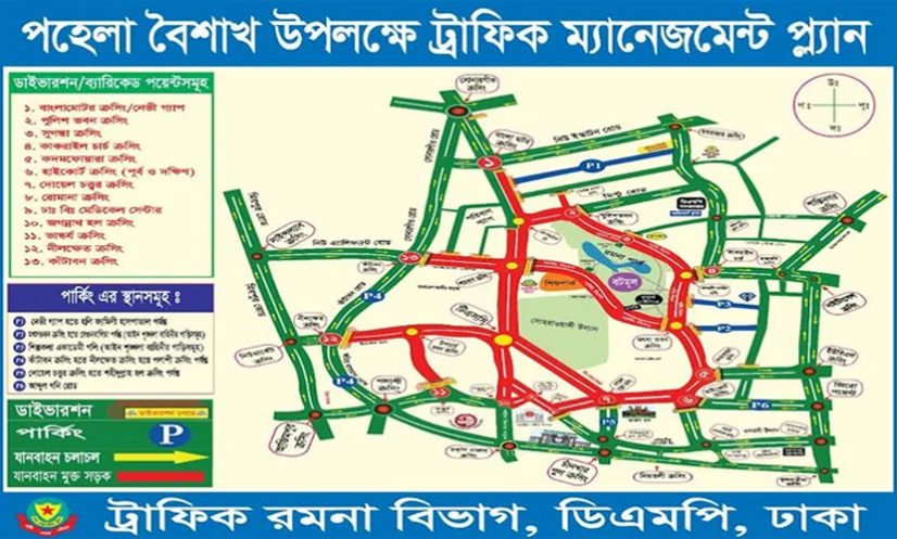 সোমবার (১৪ এপ্রিল) ভোর ৫টা হতে রমনা পার্ক (রমনা বটমূল), সোহরাওয়ার্দী উদ্যান ও ঢাকা বিশ্ববিদ্যালয় এলাকা ও আশপাশের নিম্নলিখিত এলাকাসমুহে সড়কে যানচলাচল নিয়ন্ত্রণ করার লক্ষ্যে রাস্তা বন্ধ/রোড ডাইভারশন দেওয়া হবে-