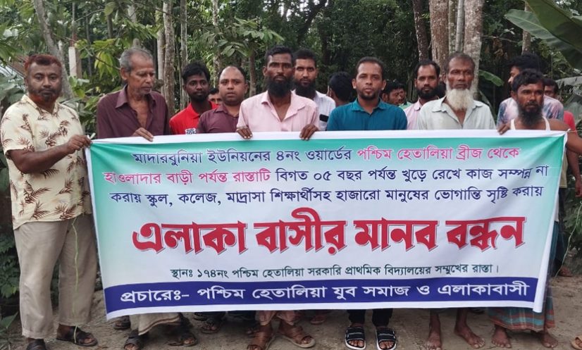 পটুয়াখালী: পটুয়াখালী সদর উপজেলার মাদারবুনিয়া ইউনিয়নের পশ্চিম হেতালিয়া ব্রিজ থেকে হাওলাদার বাড়ি পর্যন্ত রাস্তা সংস্কারের দাবিতে মানববন্ধন ও বিক্ষোভ করেছে এলাকাবাসী।