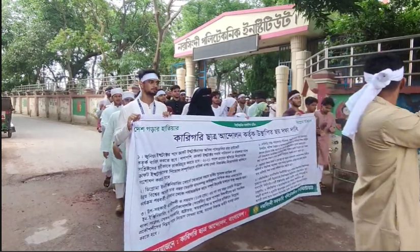 সারাদেশের সঙ্গে এক যোগে নরসিংদীর সকল সরকারি-বেসরকারি কারিগরি শিক্ষার্থীরা অংশগ্রহণ করে এই কাফন মিছিলে।