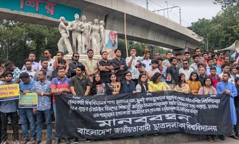ঢাকা: প্রাইমএশিয়া বিশ্ববিদ্যালয়ের শিক্ষার্থী জাহিদুল ইসলাম পারভেজের হত্যাকারীদের দ্রুত গ্রেফতার ও বিচারপূর্বক দৃষ্টান্তমূলক শাস্তির দাবিতে মানববন্ধন করেছে ঢাকা বিশ্ববিদ্যালয় শাখা ছাত্রদল।