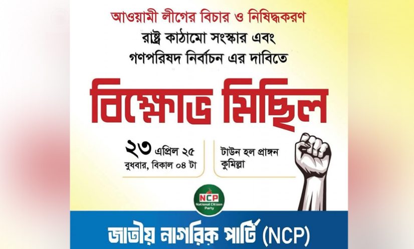 এর আগে মঙ্গলবার (২২ এপ্রিল) বিকেল ৫টায় আওয়ামী লীগ নিষিদ্ধ, গণহত্যার বিচার ও সংস্কারের দাবিতে রাজধানীর খামারবাড়ি মোড়ে বিক্ষোভ মিছিল করেছে এনসিপি। সোমবার বিকালে আগামী ১৫ দিনের মধ্যে আইন তৈরি করে আওয়ামী লীগকে নিষিদ্ধের দাবি জানিয়েছে এনসিপি।