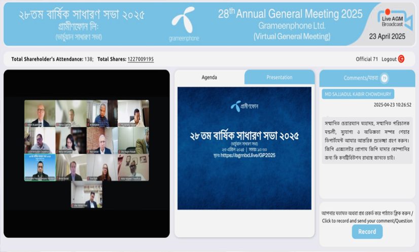 ঢাকা: গ্রামীণফোন লিমিটেড এর ২৮তম বার্ষিক সাধারণ সভা (এজিএম) অনুষ্ঠিত হয়েছে। বাংলাদেশ সিকিউরিটিজ অ্যান্ড এক্সচেঞ্জ কমিশনের নীতিমালা মেনে ও শেয়ারহোল্ডারদের অর্থবহ অংশগ্রহণ নিশ্চিত করে বুধবার (২৩ এপ্রিল) ডিজিটাল প্ল্যাটফর্মে বার্ষিক সাধারণ সভাটি অনুষ্ঠিত হয়; যা কোম্পানির সামগ্রিক অগ্রগতি ও সাফল্যের জন্য অপরিহার্য। এতে ১৭০ শতাংশ নগদ লভ্যাংশ ঘোষণা করা হয়েছে।