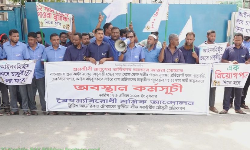 কুষ্টিয়া: বাংলাদেশ শ্রম আইন ২০০৬ অনুযায়ী ২০১২ সাল থেকে কোম্পানির পাওনা মুনাফা, প্রভিডেন্ট ফাণ্ড, গ্রাচ্যুইটি, নিয়োগ পত্র ও আইন বহির্ভূতভাবে বাইরে রাখা শ্রমিকদের চাকুরিতে পুনর্বহালসহ ২২ দফা দাবিতে অবস্থান কর্মসূচি করেছেন ব্রিটিশ আমেরিকান টোব্যাকো কুষ্টিয়া লীফ কারখানার মৌসুমী শ্রমিকরা।
