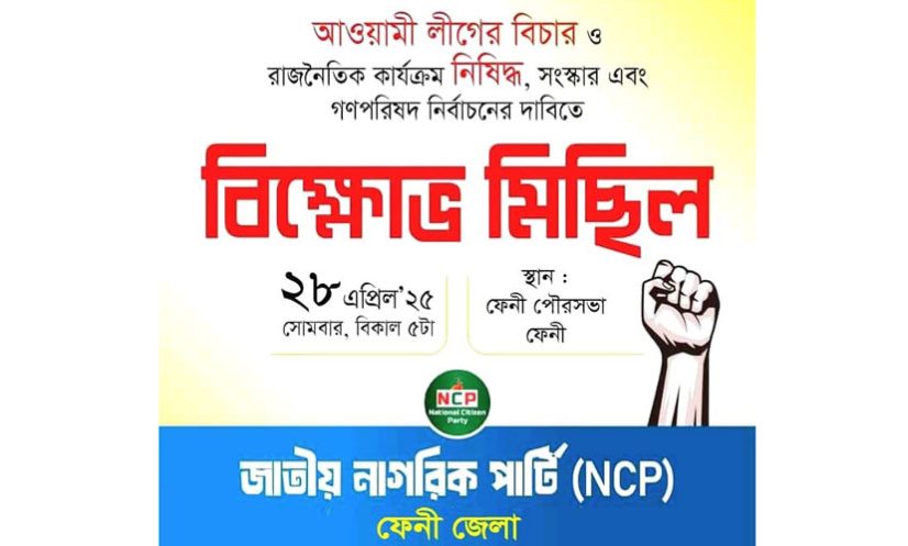 ঢাকা: আওয়ামীলীগ নিষিদ্ধ, গণহত্যার বিচার ও সংস্কারের দাবিতে আজ ৮ম দিনে মিছিল ও বিক্ষোভ সমাবেশ করবে ফেনী জাতীয় নাগরিক পার্টি (এনসিপি)।