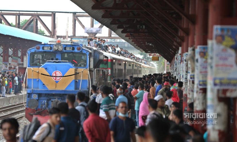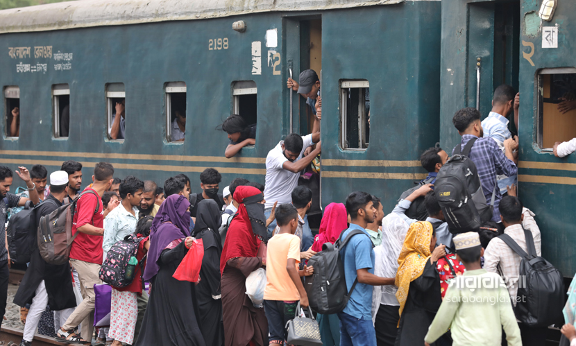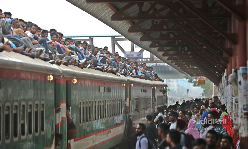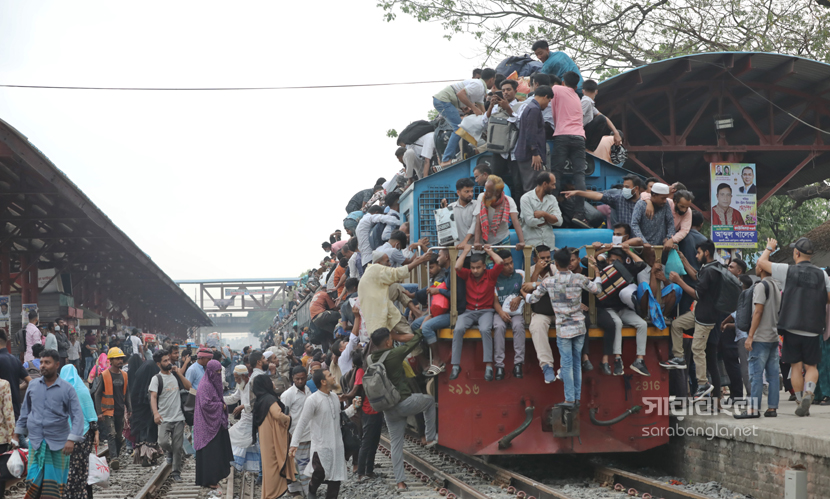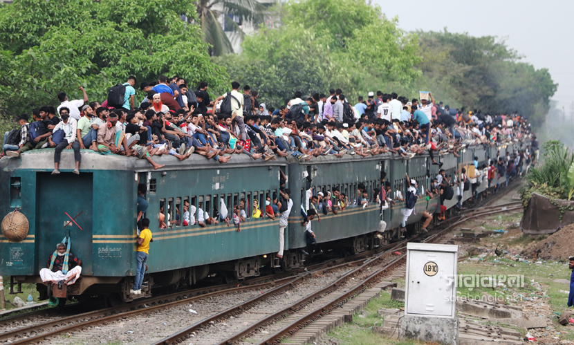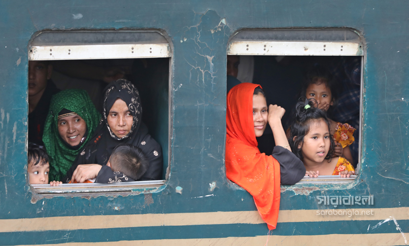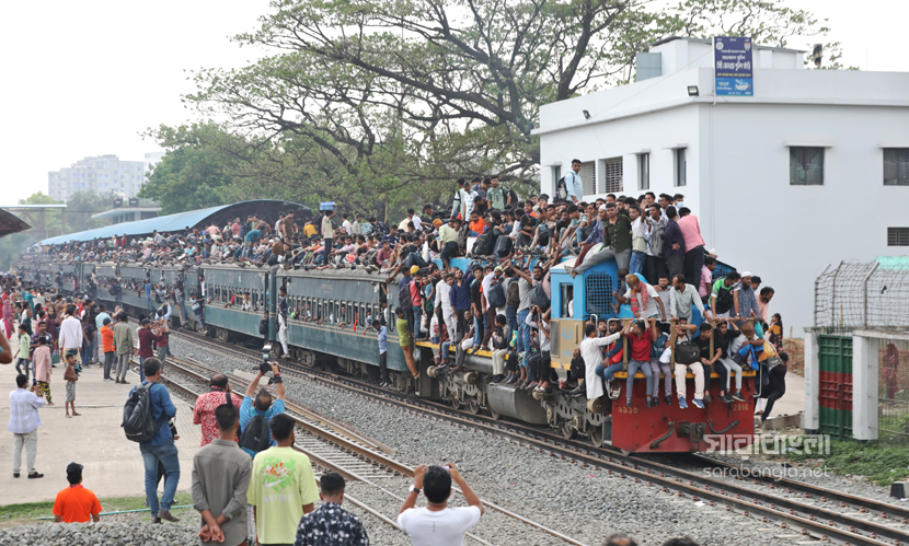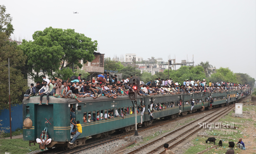 পবিত্র শাওয়ালের চাঁদ দেখা সাপেক্ষে দুয়েকদিন পরেই দেশে উদযাপিত হবে ঈদুল ফিতর। তাই নাড়ির টানে ঘরমুখো লাখো মানুষের স্রোত। সেই স্রোত গিয়ে মিলেছে এখন রেলপথে। ট্রেনযাত্রা স্বস্তির জেনে সবাই যেন সেদিকে ছুটছে। কিন্তু দুদিন আগের স্বস্তির ভ্রমণ এখন দুঃস্বপ্নে পরিণত হয়েছে। তবু মানুষকে যেতে হবে প্রিয়জনের কাছে। তাই তো ট্রেনের বগি শেষে ভিড় এখন ট্রেনের ছাদেও। ট্রেন নয় যেন এক মানবযান ছুটে চলছে। ঈদ উপলক্ষ্যে রাজধানীর টঙ্গী রেলওয়ে স্টেশন থেকে ট্রেনযাত্রার ছবিগুলো তুলেছেন সারাবাংলার সিনিয়র ফটো করেসপন্ডেন্ট হাবিবুর রহমান।